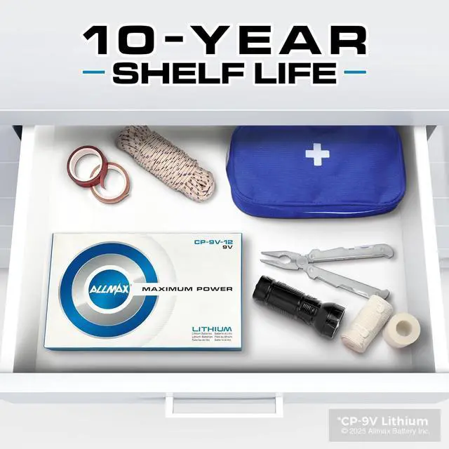 10-Year Shelf Life Allmax 9V Lithium Batteries are always fresh and maintain power for up to 10 years in proper storage. This makes Allmax batteries the perfect choice for long-term storage and emergency preparedness kits.