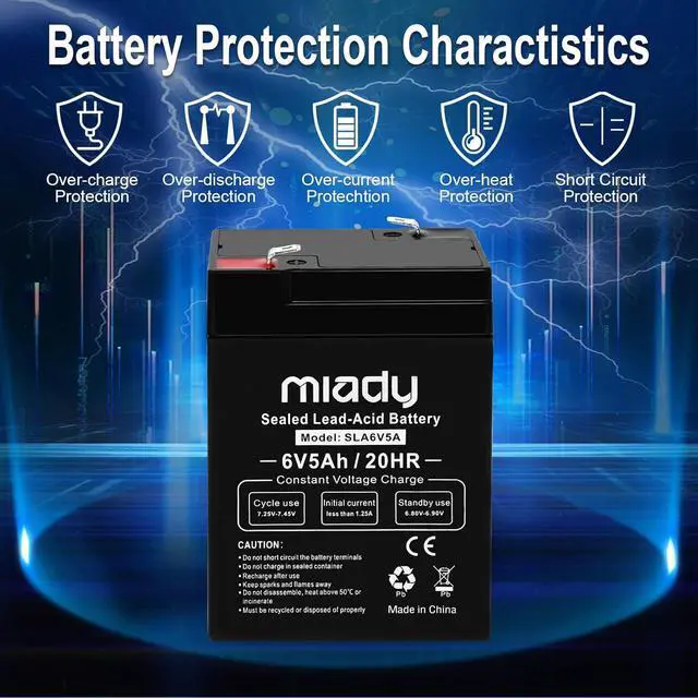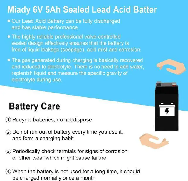 What You GetMiady 6V 5AH Sealed Lead Acid (SLA) rechargeable maintenance free battery (2 Pack) and also back our products for 12 months. 24*7 friendly and professional customer supports.