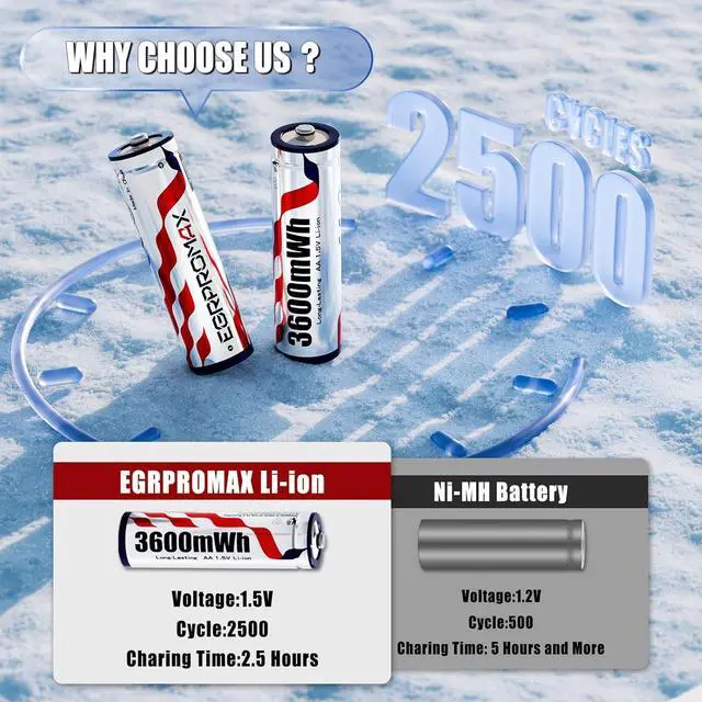 2500+ Recharge Cycles Built to Last for YearsEngineered to withstand over 1600 full charge and discharge cycles, these AA rechargeable lithium batteries outlast thousands of disposable batteries. Ideal for households that want to save money and reduce battery waste without sacrificing performance.