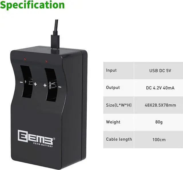• BASIC INFOVoltage: 3.7V; Capacity: 45mAh; Weight: approximate 2.6g; Diameter: 20mm, Height: 3.2mm. Please charge the battery with EEMB dedicated charger. Packing included: LIR2032 Battery X 4, Charger x 1. Note: The product packaging may be different in each batch.