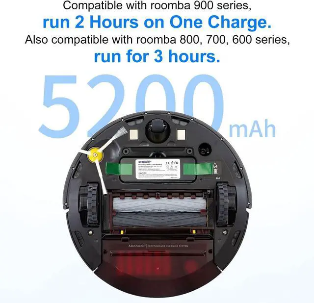 Roombas: Fully compatible with Roomba 900 series, it can power the 900 series uninterruptedly for 2 hours on a single charge. Compatible with Roomba 600 to 800 series, performance is even better, and the runtime is extended by 2.5 to 3.5 hours. Its an ideal replacement for Li-ion battery and an upgrade for Ni-MH Roomba battery.