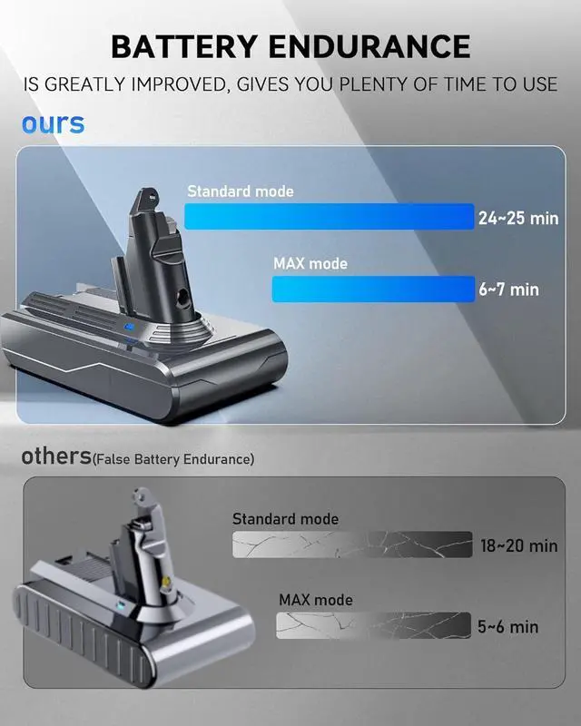 Up to 23 minutes of fade-free suction: The V6 battery is usable for up to 23 minutes in normal mode and up to 5 minutes in high-performance mode. It allows a steady consumption of battery power, as well as a fast-charging time of 3.5 hours