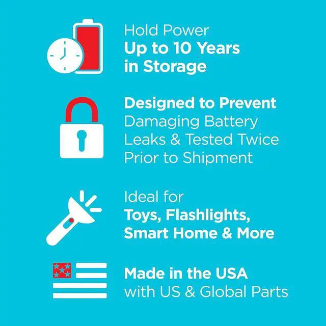 These double A batteries are designed to prevent damaging leaks and made in the USA with US and global parts