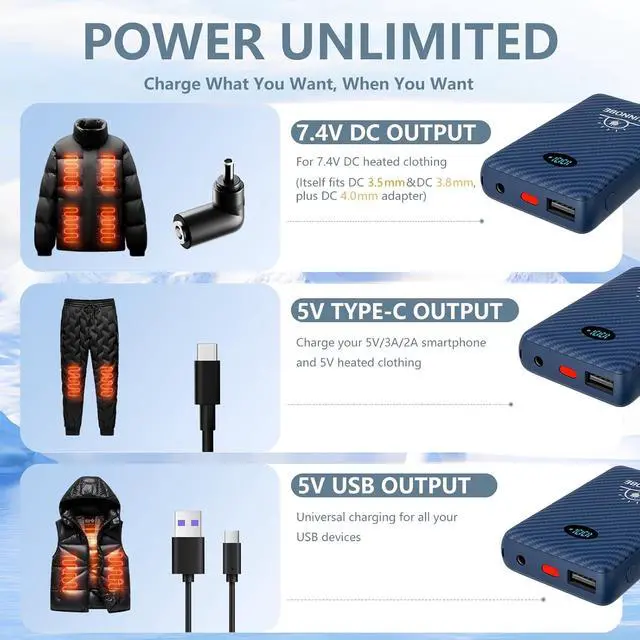 BUILT FOR HEATED APPAREL Specially engineered 7.4V battery pack heated vests, jackets, pants, and other heated gear with steady, reliable output. Three portsDC, USB-A, and Type-CSupports simultaneous charging of 7.4V and 5V devices, compatible with ORORO and Venustas. (Itself fits DC 3.5 mm&DC 3.8 mm, plus DC 4.0 mm adapter)