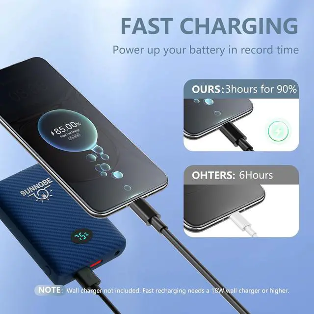 FAST RECHARGING & ADVANCED PROTECTION Supports multiple charging methods for quicker turnarounds: about 6 h with a 5V/2A (10W) charger, 4 h 30 min with a 5V/3A (15W) charger, and just 3 h 30 min with an 18W PD charger (charger not included). Certified to UL, FCC, CE, RoHS, and PSE standards, with multi-layer protection against over-voltage, over-current, over-charge, and short circuits
