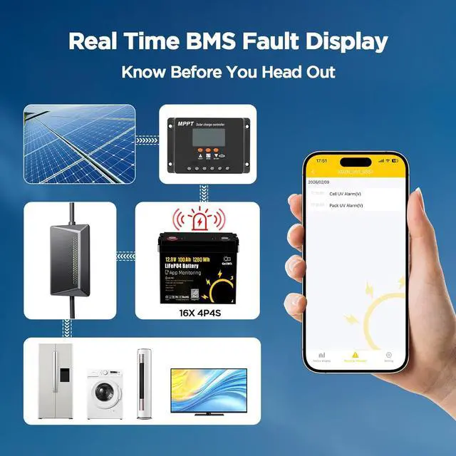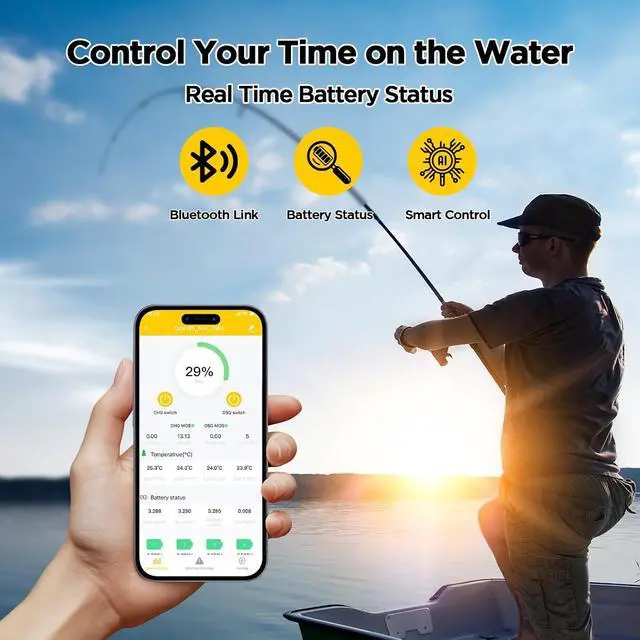 Water: Stay in control during every fishing trip. Built-in Bluetooth 5.0 connects to your smartphone, allowing real-time monitoring of battery level, voltage, current, and temperature. Check power status anytime from your seat and receive instant alerts to help keep your trolling motor, fish finder, and onboard electronics running smoothly on the water