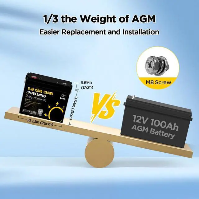 Power: Built with EV-grade LiFePO cells, this lithium battery offers significantly higher energy density than traditional AGM batteries. It weighs only about 1/3 of a same-capacity 12V 100Ah AGM battery and takes up 15% less space, while delivering up to 270% of the energy of a same-weight AGM battery