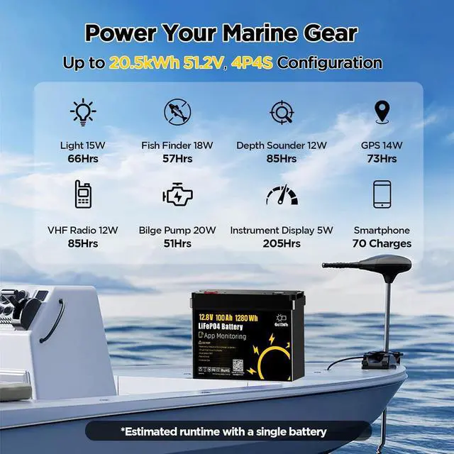 Trolling Motors & Marine Electronics: With 1280Wh of energy from a compact 12.8V 100Ah design, this LiFePO marine battery provides stable deep-cycle power for trolling motors, fish finders, livewells, and other fishing boat electronics. The system also supports 4P4S expansion, allowing scalable power setups up to 51.2V / 20.5 kWh for longer days on the water