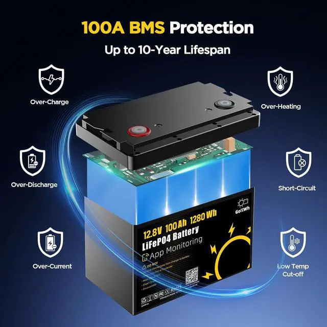 Built-in 100A BMS with Low-Temperature Protection: An advanced 100A Battery Management System (BMS) provides multiple protections including over-charge, over-discharge, short circuit, over-current, and overheating protection. A low-temperature cut-off below -20°C (-4°F) during discharge helps protect the battery and maintain reliable performance in cold-weather fishing conditions