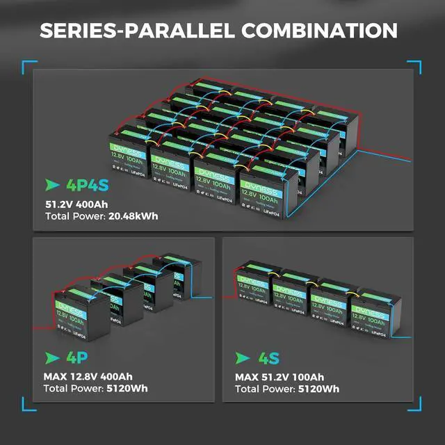 Meet the Needs of Various ScenariosDyness Group 24 LiFePO4 battery is nearly 25% smaller than Group 31 size, so that you can connect up to 4 in series and 4 in parallel with 16 batteries to build a substantial 20.48 kWh storage system for large energy demands. Power your RV adventures, solar energy systems, home backup, off-grid living, boating, and more with this single, high-performance Dyness battery.