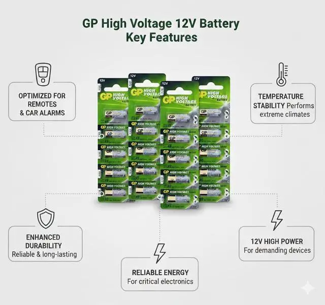 1 Powerful 12V Energy Output Experience strong and stable 12V performance with GP A23 alkaline batteries, specially designed to deliver high power for car remotes, wireless doorbells, alarms, cameras, and key fobs. Each battery ensures steady voltage output for optimal performance, even in high-drain electronic devices.