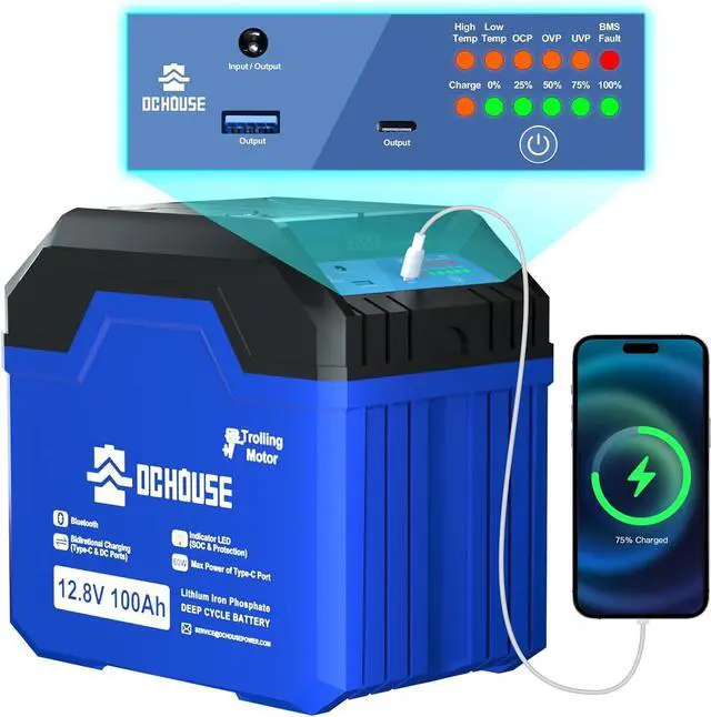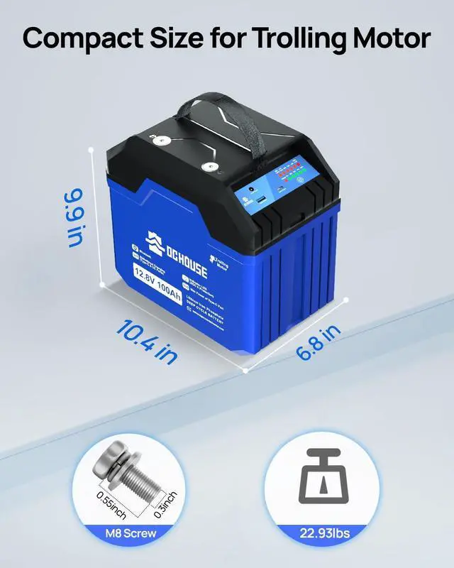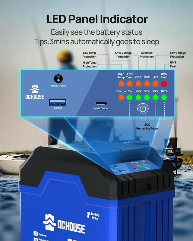 SOC Status Indicators: Upgraded 3.0 12V 100Ah trolling motor battery has a visual LED indicator, which is very simple and clear real-time to monitor the SOC battery remaining power, high temperature, low temperature, short circuit, overvoltage, low voltage and BMS fault indication and charging indication. Ideal for a variety of applications, such as trolling, camping, RVs, and more.