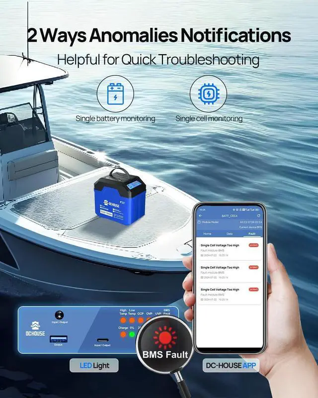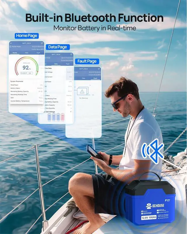 Bluetooth APP Monitoring: DC HOUSE 12V100AH battery has built-in Bluetooth, which can connect with DC HOUSE APP (Bluetooth signal range 5-10 meters. It is convenient to monitor battery information such as SOC, voltage, current, etc., and the data is accurate to the specific cell of a battery, there is a special fault display page to help troubleshoot.