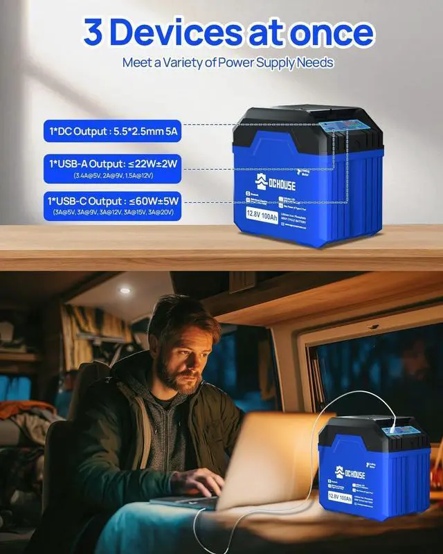Multi Port Adapter: DC HOUSE 100AH battery with 1*USB-A & 1*USB-C & 1*DC PORT that can charge 3 devices at the same time, which can greatly meet different charging needs. Perfect for families and outdoor travelers, it can charge smartphones, smart watches, cameran, fan and computer