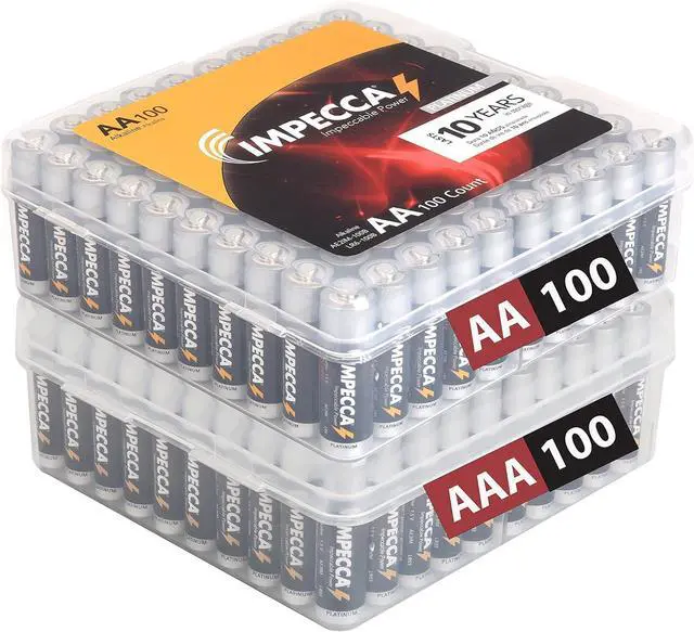 AAA combo pack: 200 pieces of Super Alkaline Batteries packed in 2 reusable plastic packs of 100xAA 100xAAA batteries, making it easy to store and transport. Impecca Alkaline batteries are ultra-long lasting, high-performance, leak-resistant, with up to 1.5 volts maximum power that is consistent and reliable for all your devices.