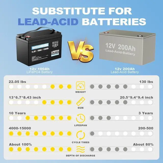 Lightweight & Universally CompatibleWeighing only 22.05 lbs, it' s 50% lighter than a same-capacity lead-acid battery, making installation and movement effortless. Its a true plug-and-play replacement, perfect for Solar Systems, RVs, Marine applications, Home Backup, Off-Grid setups, Trolling Motors, and more.