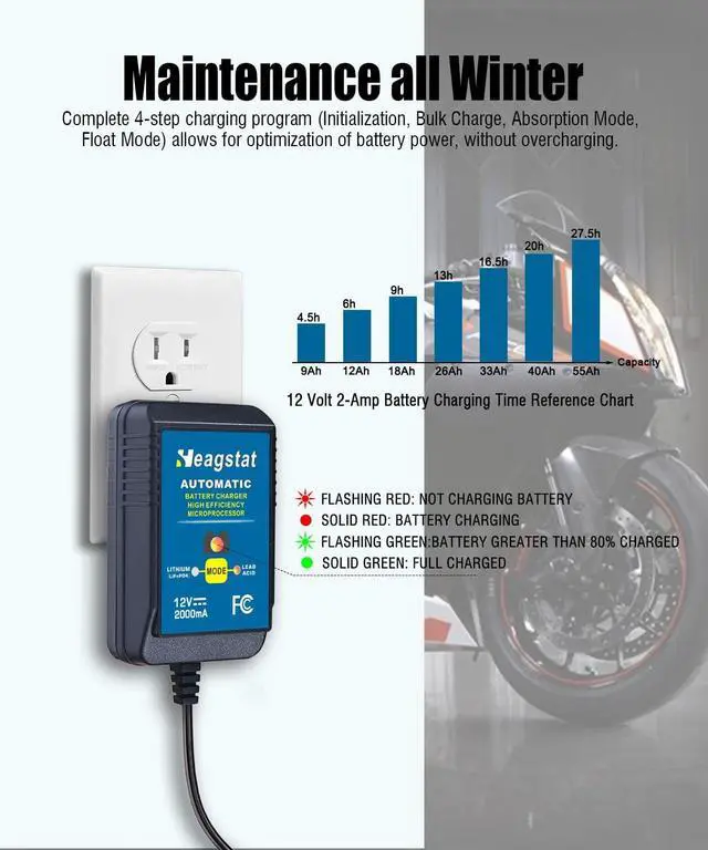 The battery can be maintained throughout the winter. Automatic charge cycle functionality switches to float mode after fully charging the battery.