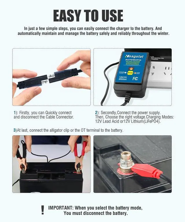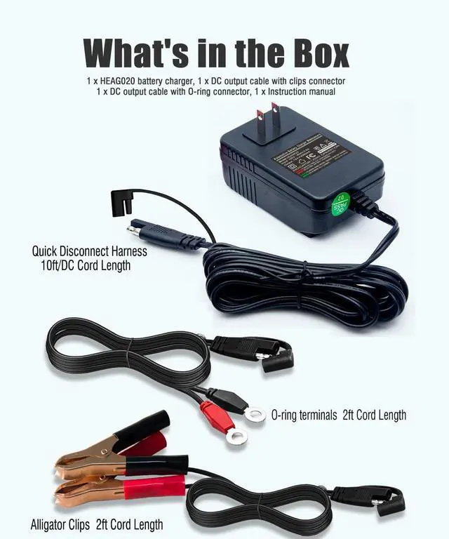 Plugs into a 120V outlet and outputs 12 volt 2 Amp, Spark proof during lead connection, reverse polarity protected (will not supply power unless the connection is correct). with 12FT cable, Easy sae connection to vehicle battery using the included battery clips and O-ring terminals, with quick disconnect harness.