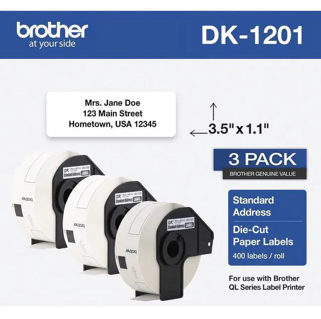 Printing professional labels is easy when you depend on Brother Genuine DK replacement labels for your Brother QL label printers. The DK-1201 die-cut standard address label is a Brother Genuine replacement product that delivers long-lasting reliability you can trust to protect your investment. These replacement label rolls are ideal for Brother QL-500 and QL-550 label printers. They are also compatible with 13 additional Brother label printers. Each die-cut label measures 1.14 x 3.5 inches (29mm x 90mm), with 400 individual white paper labels per replacement roll. Brother Genuine replacement labels are precision fit to work specifically with Brother label printers.