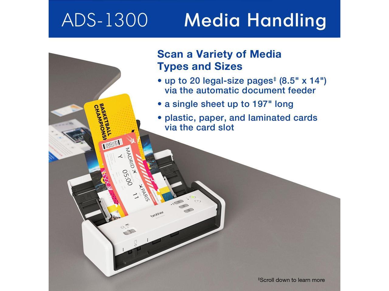 HANDLES A WIDE VARIETY OF DOCUMENT SIZES. Scan single pages up to 197" long, or use the built-in card reader specialized for any type of card paper or plastic like business cards, credit cards, or ID cards. BUNDLED WITH 3 SOFTWARE APPS. Save, store, and share your files using the Brother iPrintScan desktop software, and take complete control over your PDF organization, creation, and editing with Kofax PaperPort 14SE and Kofax Power PDF(3).