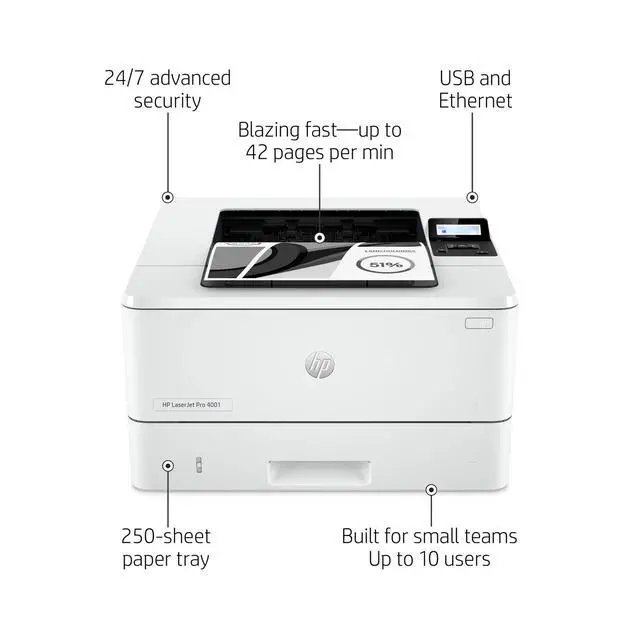 HP LaserJet Pro 4001n Laser Printer, Black And White Mobile Print Up to 80,000