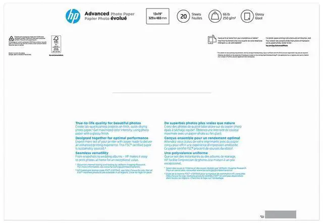 Model: HP Advanced Photo Paper Glossy 65 lb 13 x 19 in. (329 x 483 mm)