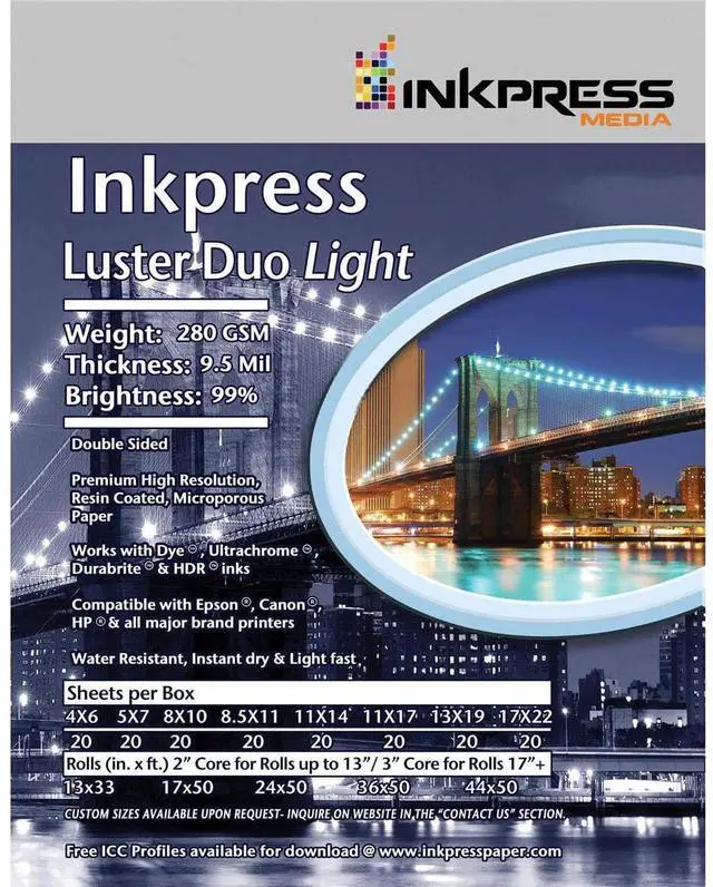 This feature makes it an ideal choice for professional photographers, graphic designers, and hobbyists who demand versatility in their printing materials. One of the standout features of this inkjet paper is its microporous layer. This innovative design allows for quick absorption and instant drying of both dye and pigment-based inks. Whether you're using UltraChrome or any other pigment ink, you won't have to worry about issues like puddling, black highlighting, or ink lying on top of the paper's surface. In summary, the Inkpress Luster Duo Light Double-Sided 8.5 x11" Photo Inkjet Paper provides a reliable and high-quality medium for your printing needs.
