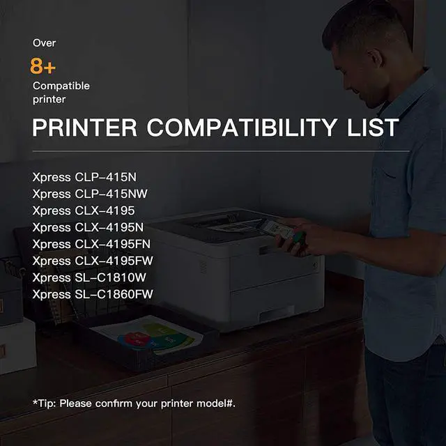 Please confirm your printer model#.Xpress CLP-415NXpress CLP-415NWXpress CLX-4195Xpress CLX-4195NXpress CLX-4195FNXpress CLX-4195FWXpress SL-C1810WXpress SL-C1860FWRead more Easy Installment Step-1:Shake for 5 seconds to loosen toner powder distribution Easy Installment Step-2:Remove orange protective cap from toner Easy Installment Step-3:Insert the toner cartridge into your printer STEP 1 STEP 2 STEP 3CLT-504S Toner Cartridge (4 Pack)Combo 1 Black, 1 Cyan, 1 Magenta, 1 Yellow (4 Pack)Item Weight 7.98 poundsPage Yield2,500 pages per Black cartridge; 1,800 pages per color cartridge (at 5% coverage)Compatible PrinterXpress CLP-415N, CLP-415NW, CLX-4195, CLX-4195N, CLX-4195FN, CLX-4195FW, SL-C1810W, SL-C1860FWHave a question?Find answers in product info, Q&As, reviews There was a problem completing your request