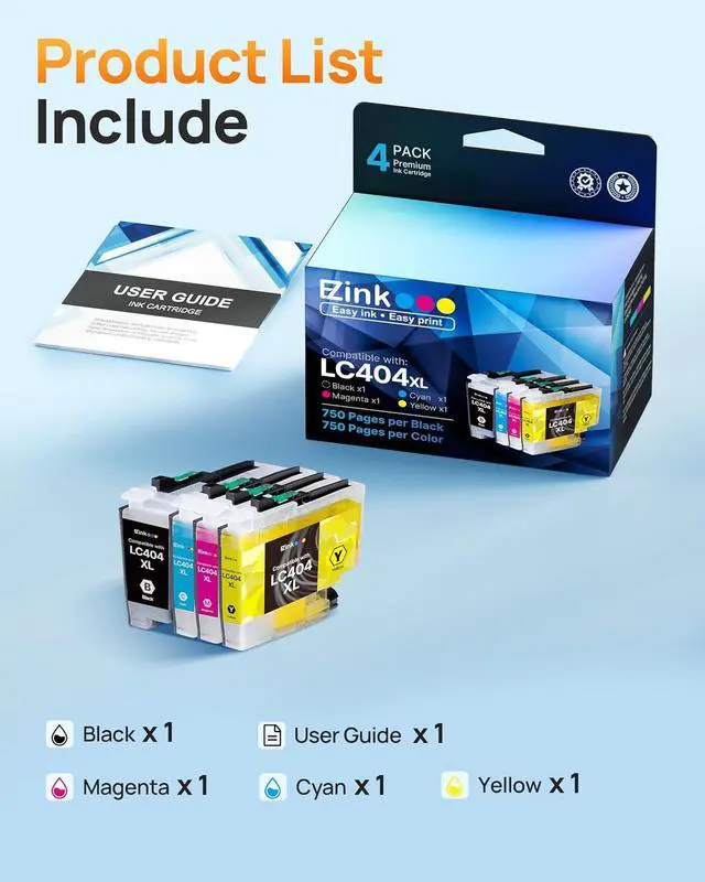 Package content: 4/Pack LC404 compatible for brother lc404 ink cartridge with high yield ( 1 x Black LC404XL BK, 1 x Cyan LC404XL C, 1 x Magenta LC404XL M, 1 x Yellow LC404XL Y, 1 x User Guide)