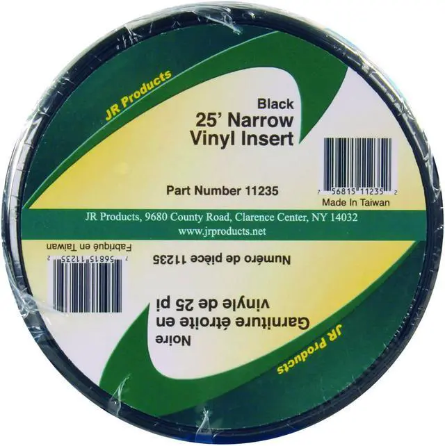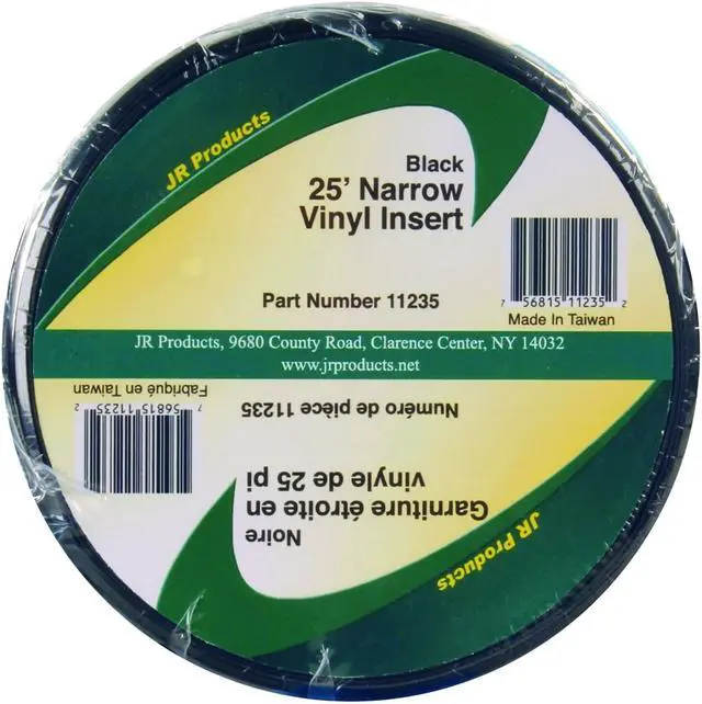 JR PRODUCTS 11235 JR Products 11235 Narrow Vinyl Insert - Black, 3/4" x 25 The JR Products Narrow Vinyl Insert is RoHS Certified to ensure the highest quality available! Lifetime Warranty. Dimensions: 3/4" x 25. Color: Black. MPN:11235 756815112352