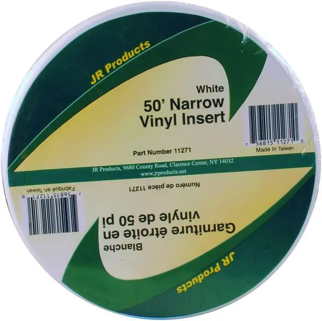 JR PRODUCTS 11271 JR Products 11271 Narrow Vinyl Insert - White, 3/4" x 50 The JR Products Narrow Vinyl Insert is RoHS Certified to ensure the highest quality available! Lifetime Warranty. Dimensions: 3/4" x 50. Color: White. MPN:11271 756815112710