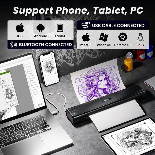 Wide Range of CompatibilityThe TATTMUSE stencil printer links to iPhones, Android phones, iPads, and tablets via Bluetooth.The USB-C port on the body of the TATTMUSE tattoo machine supports both laptops and desktop computers, and is compatible with Windows, MacOS, ChromeOS, and Linux systems