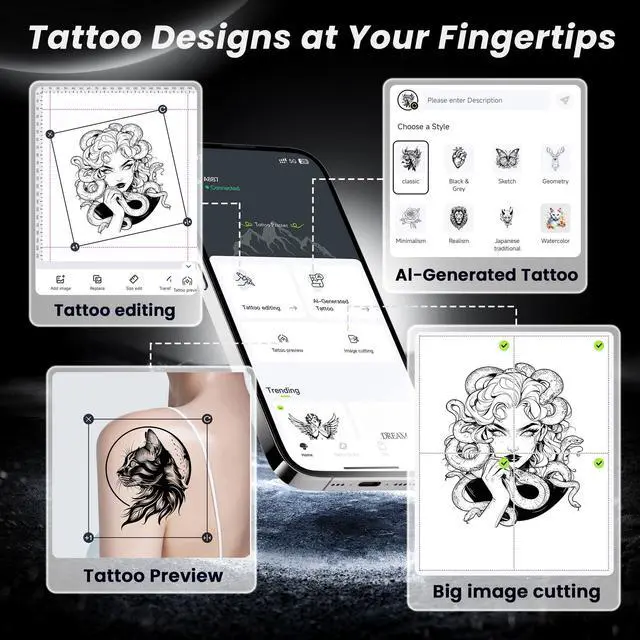 Powerful ApplicationThe app for the TATTMUSE tattoo thermal printer allows you to enter combinations of up to 9 patterns for quick one-click printing, which can be customized with edits and adjustments to get any desired effect. In addition, our app adds an image cutting function for large tattoo stencils, which allows you to accurately copy large tattoos onto the skin. The app will also be updated regularly so you get the latest features