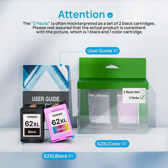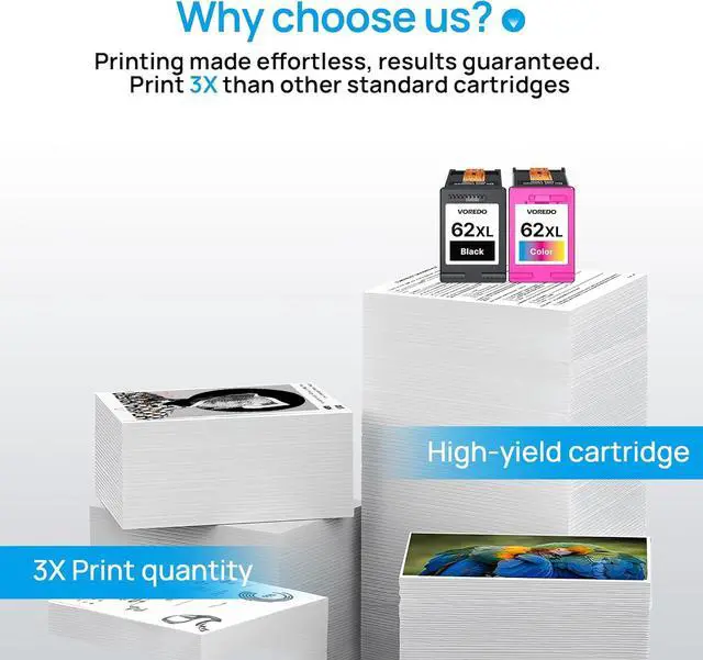 Reliable & High Quality: VOREDO for hp 62xl ink cartridge combo pack ensures consistent results. Precision printheads prevent clogging/waste for smooth, smudge-free printing. Advanced ink delivers sharp text and vivid colors with natural, detailed prints ideal for all documents.