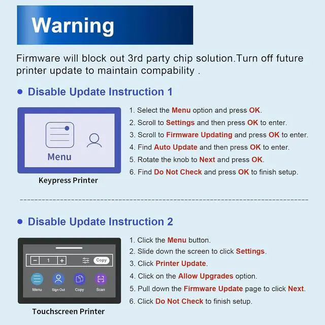 Our 218A toner cartridges use a third-party chip and will need to be disabled for future printer updates to maintain compatibility. For setup assistance, please refer to our illustrated guide or reach out to us for further assistance.