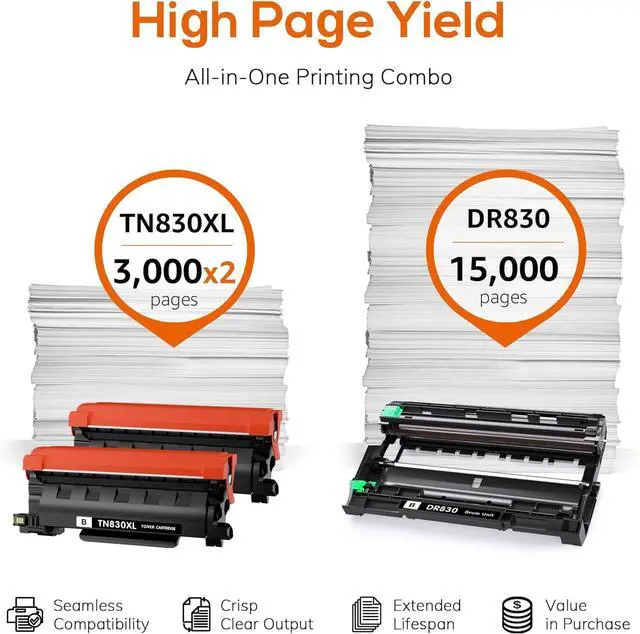 Includes 2 high-yield TN830XL toner cartridges and 1 DR830 drum unit, offering both replacement toner and drum in one convenient setno need to purchase separately.