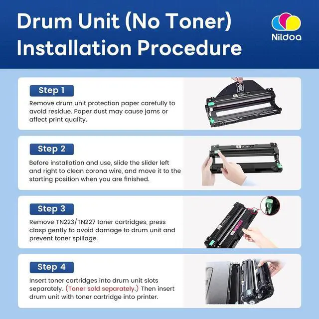 Package Contents: Nildoa 4 Pack DR223CL Drum Unit Replacement for Brother DR-223CL Drum Unit High Yield Only Drum (1Black/1Cyan/1Magenta/1Yellow)