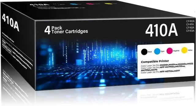 Package Included: 410A toner cartridges 4 pack compatible for HP 410A toner cartridges contains 1 x 410A Black toner(CF410A), 1 x 410A Cyan toner(CF411A), 1 x 410A Yellow toner(CF412A), 1 x 410A Magenta toner(CF413A)