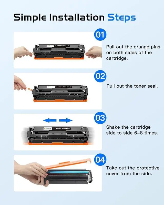 2.Package Contents: 125a toner cartridges 4 pack (1 x 125A Black, 1 x 125A Cyan, 1 x 125A Magenta, 1 x 125A Yellow)
