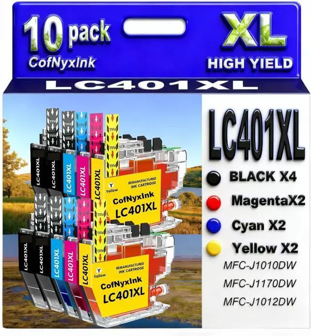 Package Contains: 10 Pack LC401XL ink cartridges. 4X LC401XL Black, 2 X LC401XL Cyan, 2 X LC401XL Magenta, 2 X LC401XL Yellow.