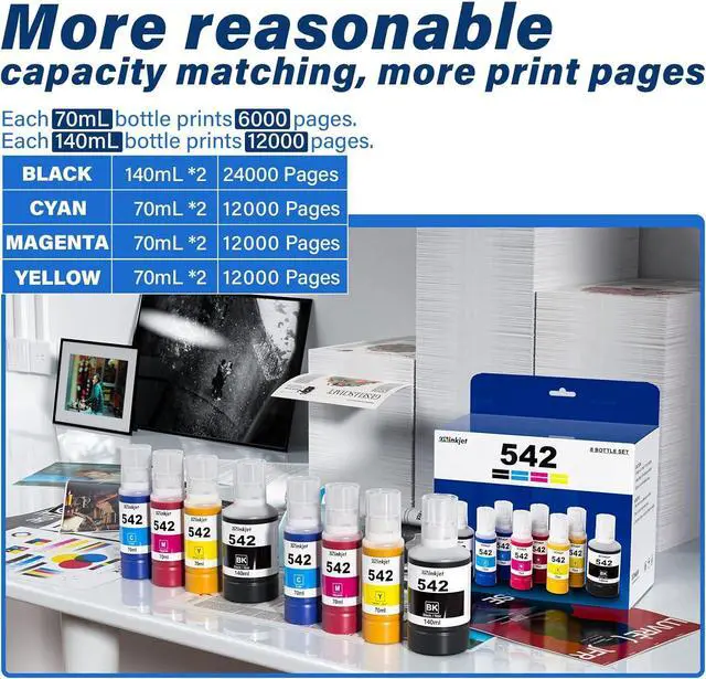 Supercharge Your Printing: You will get 8 bottles of 542 ink (2BK*140ml 2C 2M 2Y*70ml). The 542 ink refill bottles, with extra-large capacity, let you print up to 60,000 pages (24,000 pages in black, 12,000 pages in each color). Unleash printing efficiency with ease( at 5% coverage on A4 paper).