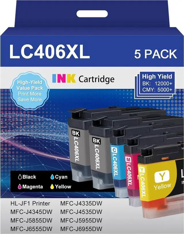 Package ContentReplacement for brother lc406xl ink cartridges 5 pack, include lc406xl black ink cartridge x2, lc406xl cyan ink cartridge x1, lc406xl yellow ink cartridge x1, lc406xl magenta ink cartridge x1.