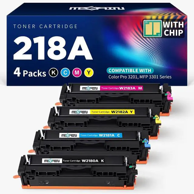 What's in the Box: 4-Pack (K/C/M/Y) 1× 218A W2180A Black Toner, 1× 218A W2181A Cyan Toner, 1× 218A W2182A Yellow Toner, 1× 218A W2183A Magenta toner cartridge.