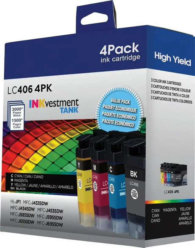 4 Packs High-yield Black and Color Ink Cartridges LC-406 4PKS set includes 1x Black, 1x Cyan, 1x Magenta and 1x Yellow. Ink is engineered to work with BROTHER printers to provide high quality, reliability and value. Come with value pack for eco-friendly packaging.