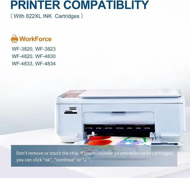 Printer Compatibility for epn 822 ink: The 822XL ink cartridges are compatible with Epson WorkForce Pro WF-3820, WF-3823, WF-4820, WF-4830, WF-4833,WF-4834 Printers