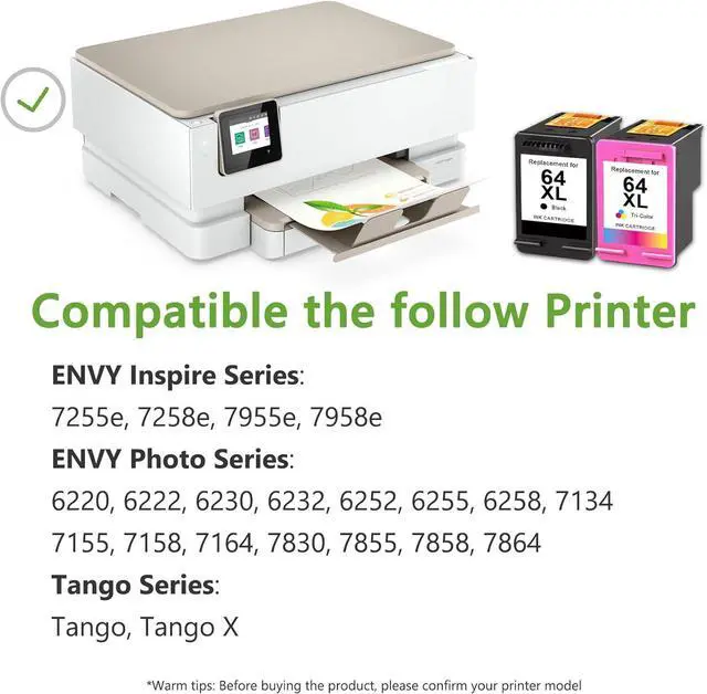 Compatible Printers: 64XL ink replacement for hp Envy Photo Series 6220, 6222, 6230, 6232, 6252, 6255, 6258, 7134, 7155, 7158, 7164, 7830, 7855, 7858, 7864, ENVY Inspire Series: 7255e, 7258e, 7955e, 7958e, Tango Series: Tango / Tango X