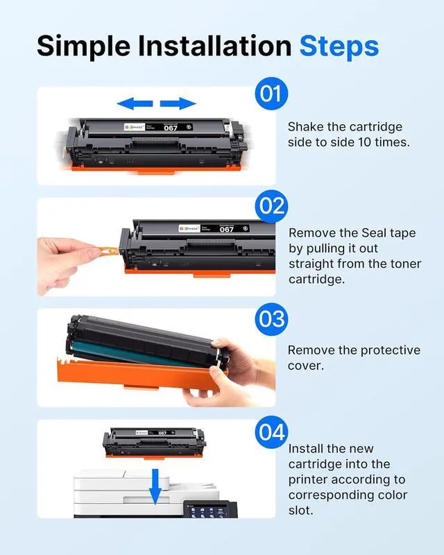 4.Package Included4 Pack of Compatible for Canon 067 Toner Cartridge Set Replacement for Canon Toner Cartridges 067 067H Toner Cartridges Set Included: 1 x 067 CRG-067 Black, 1 x Cyan 067, 1 x Yellow 067, 1 x Magenta 067