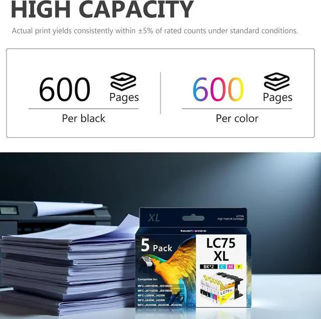 Includes: 5 Pack for LC75 XL ink cartridges(2 x Black, 1 x Cyan, 1 x Magenta, 1 x Yellow) for printers to perfect balance of efficiency & cost control