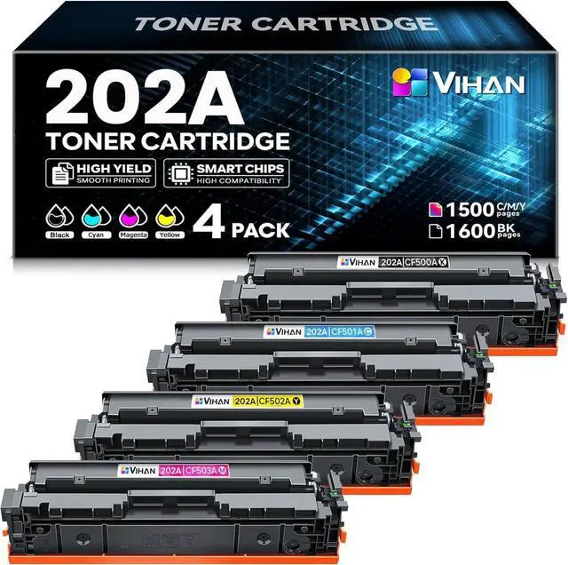 Package Contents: Vihan 4 Packs 202A Toner Cartridges Replacement for HP 202A CF500A Toner Cartridges, 202A Black Toner X 1, 202A Cyan Toner X 1, 202A Magenta Toner X 1, 202A Yellow Toner X 1.