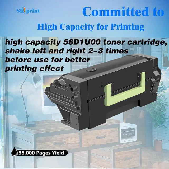 SkyPrint 58D1U00 toner cartridges come with intelligent chips that automatically recognize and provide printing, Not damaging the machine,Shake the toner cartridge horizontally 2-3 times before use to evenly distribute the toner